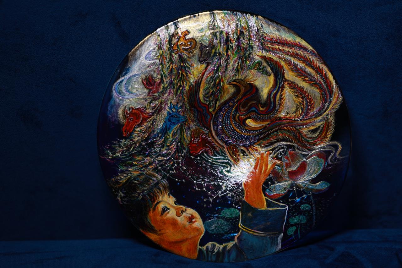 创作中,取金粉点缀星辰,以矿物调和底色,木笔蘸墨勾画空洞,再经猛火淬真金不怕火琉璃,让青龙、白虎、朱雀、玄武在玻璃上渐次露出,金木水火土的流转之意遁入其间。同期,她还参照古代天文图书与《步天歌》,将七宿的动物预想融入创作,让非遗玻璃画更具灵动气韵。