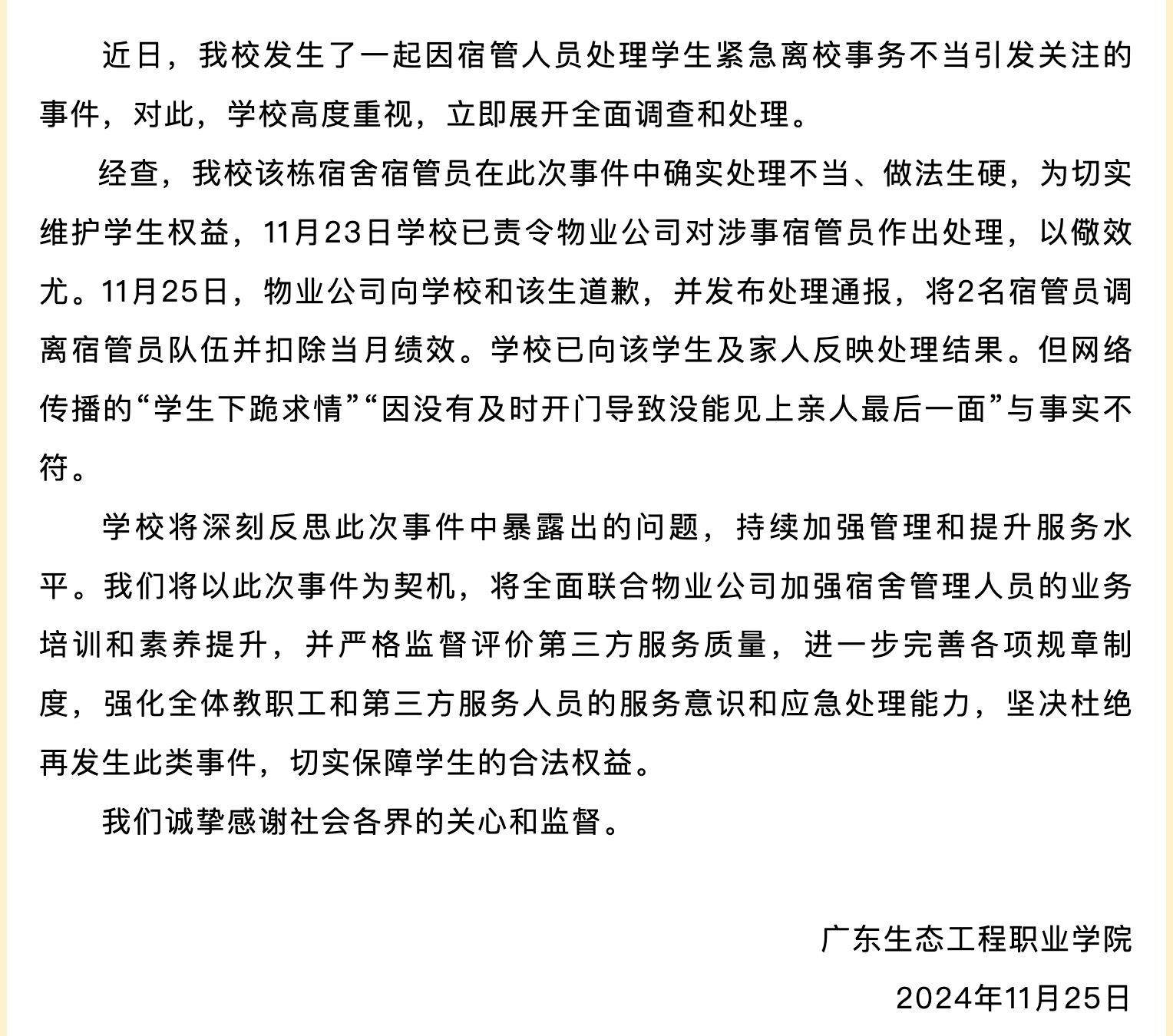 对此,记者致电广东生态工程奇迹学院,该校经营认真东说念主回话,通过检察监控视频并未发现学生下跪,但宿管的处理时势如实欠妥。