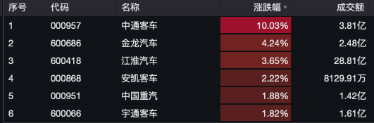 汽车整车板块盘初走高。中通客车涨停,江淮汽车、中国重汽、安凯客车、宇通客车纷繁上扬。