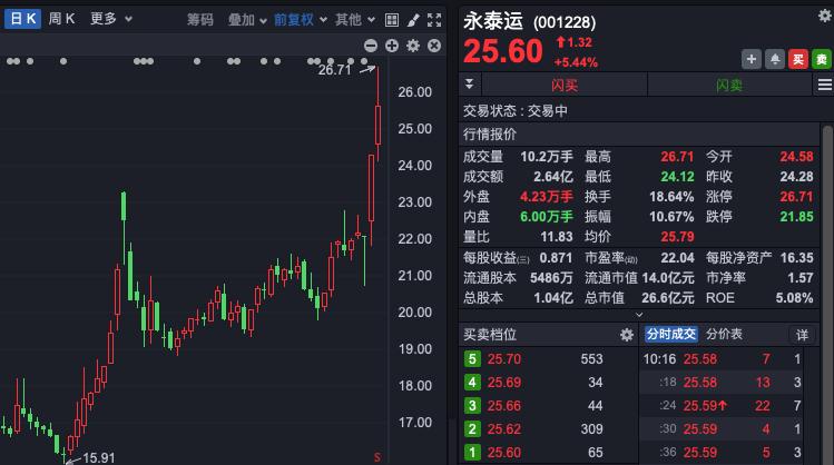 物流板块也再度活跃。永泰运盘中一度涨停,最新涨幅为5.44%。中储股份涨近8%,龙洲股份、华鹏飞、嘉诚国际跟涨。