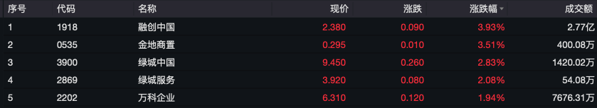 盘面上,内房股集体走强。扫尾发稿,融创中国、金地商置、绿城中国等涨超2%。