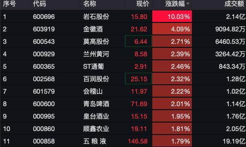 白酒板块再度活跃。岩石股份涨停,水井坊涨超3%,皇台酒业、五粮液、顺鑫农业、金徽酒、酒鬼酒等跟涨。