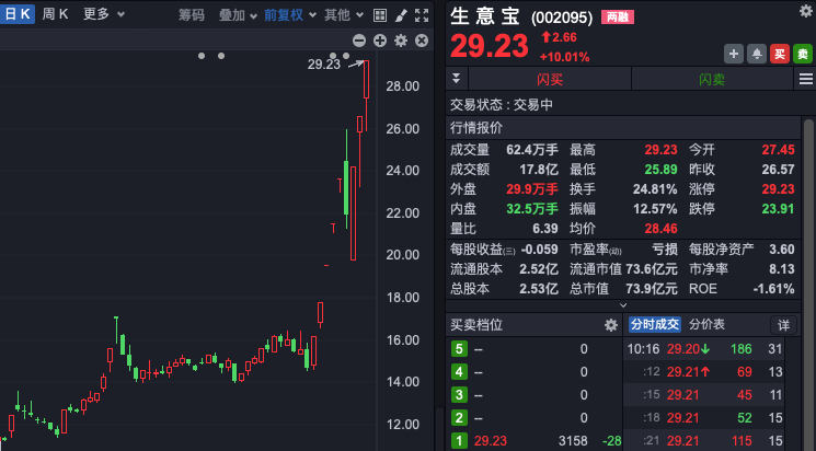 跨境电商板块弘扬强势。跨境通6天5板,三态股份、星徽股份、若羽臣涨停。